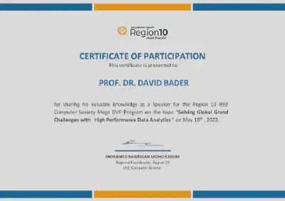 David A. Bader is a Distinguished Professor and founder of the Department of Data Science and inaugural Director of the Institute for Data Science at New Jersey Institute of Technology. Prior to this, he served as founding Professor and Chair of the School of Computational Science and Engineering, College of Computing, at Georgia Institute of Technology. Dr. Bader is a Fellow of the IEEE, ACM, AAAS, and SIAM, and a recipient of the IEEE Computer Society Sidney Fernbach Award. He advises the White House, most recently on the National Strategic Computing Initiative (NSCI) and Future Advanced Computing Ecosystem (FACE). His interests are at the intersection of high-performance computing and real-world applications and has co-authored over 300 scholarly papers and has best paper awards from ISC, IEEE HPEC, and IEEE/ACM SC. Dr. Bader is Editor-in-Chief of the ACM Transactions on Parallel Computing and previously served as Editor-in-Chief of the IEEE Transactions on Parallel and Distributed Systems.