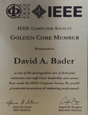 In 2010, David A. Bader received the IEEE Computer Society Golden Core Award. A plaque is awarded for long-standing member or staff service to the society. This program was initiated in 1996 with a charter membership of 450. Each year the Awards Committee will select additional recipients from a continuing pool of qualified candidates and permanently include their names in the Golden Core Member master list.
