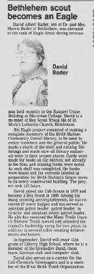 David Albert Bader, son of Dr. and Mrs. Morris Bader of Bethlehem, was elevated to the rank of Eagle Scout during ceremonies held recently in the Haupert Union Building at Moravian College. David is a member of Boy Scout Troop 346 of St. Mark’s Lutheran Church, Bethlehem.
