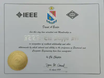 David A. Bader has this day been admitted into Membership in IEEE-Eta Kappa Nu in recognition of excellent scholarship and other attainments by which interest and ability in the profession of Electrical and Computer Engineering have been manifested.