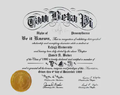 Be it known, That in recognition of exhibiting distinguished scholarship and exemplary character while a student at Lehigh University and having been duly elected by the above Chapter David A. Bader of the Class of 1990 is hereby declared and certified a member of Tau Beta Pi and is granted all the honors, insignia and privileges of this Association.