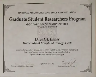 David A. Bader, University of Maryland, College Park, is awarded a NASA Graduate Student Researchers Program Fellowship in recognition of his outstanding research potential in space science and aerospace technology.