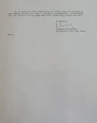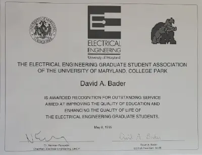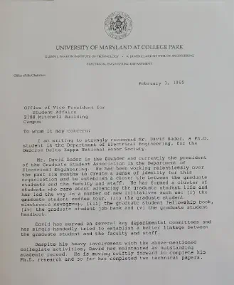 In his letter of recommendation for David Bader to the Omicron Delta Kappa National Honor Society, University of Maryland Electrical Engineering Department Chair Nariman Farvardin states: