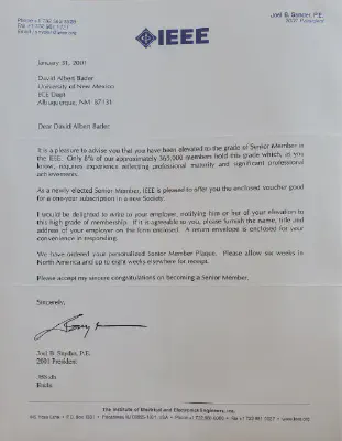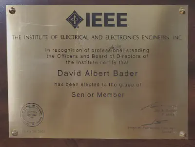 In recognition of professional standing the Offers and Board of Directors of the Institute certify that David Albert Bader has been elected to the grade of Senior Member.