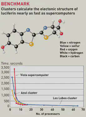 Pineda and his colleagues are running a Department of Defense-sponsored project to study software performance on a number of clusters at AHPCC. They tested GAMESS on Los Lobos, a huge 512-processor Linux-based cluster, as well as on Azul and Vista separately. The bottom line: The cluster computers performed within a factor of two of their standard supercomputing counterparts. Not bad, considering that the price of clusters is about one-tenth that of comparable supercomputers, Pineda said.