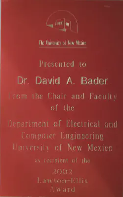 Presented to Dr. David A. Bader From the Chair and Faculty of the Department of Electrical and Computing Engineering, University of New Mexico, as a recipient of the 2002 Lawton-Ellis Award