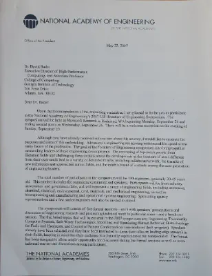 Upon the recommendation of the organizing committee, I am please to invite you to participate in the National Academy of Engineering’s 2007 U.S. Frontiers of Engineering Symposium. The symposium will be held at Microsoft Research in Redmond, WA beginning Monday, September 24 and ending around noon on Wednesday, September 26.
