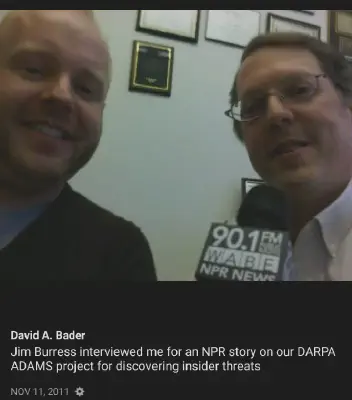 Bader interviewed by NPR on DARPA ADAMS projectNov 11, 2011 0 min readDavid A. BaderDistinguished Professor and Director of the Institute for Data ScienceDavid A. Bader is a Distinguished Professor in the Department of Computer Science at New Jersey Institute of Technology.