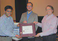 “For his research spanning a number of areas in high-performance computing, from low-level systems issues to sophisticated scientific applications,” Torsten Hoefler (center) accepted the SIAG/SC Junior Scientist Prize in Savannah from Kamesh Madduri (left) and David Bader.