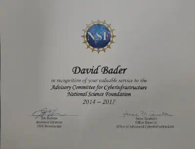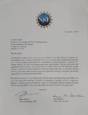 NSF Thanks Bader for Serving on the NSF Advisory Committee for Cyberinfrastructure (ACCI)
