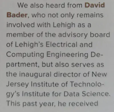 We also heard from David Bader, who not only remains involved with Lehigh as a member of the advisory board of Lehigh’s Electrical and Computer Engineering Department, but also serves as the inaugural director of New Jersey Institute of Technology’s Institute for Data Science. This past year, he received one of computing’s highest honors, the IEEE Sidney Fernbach Award for inventing commodity-based supercomputing that can be traced back to his Lehigh days. David graduated with both bachelor’s and master’s degrees from Lehigh and now lives in Manhattan.